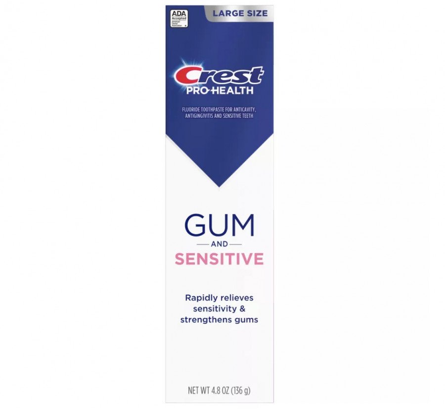 Crest Pro-health GUM AND SENSITIVE zubná pasta prináša rýchlu úľavu od citlivosti zubov a zároveň posilňuje ďasná. Vďaka špeciálnemu zloženiu s fluoridom cínatým okamžite upokojuje a vytvára ochranný štít, ktorý zabraňuje návratu citlivosti. Už po niekoľkých dňoch pravidelného používania dvakrát denne poskytuje celodennú ochranu pred bolesťou pri jedle a nápojoch.